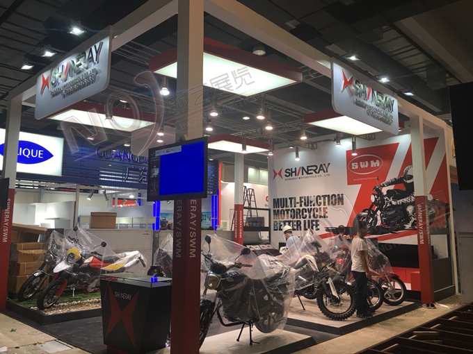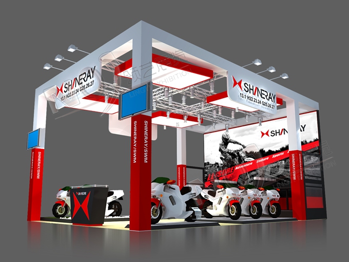 契合鑫源摩托的品牌形象和產(chǎn)品特性,采用矩形結(jié)構(gòu),再搭配燈具燈光的效果,襯托出展位簡約、時尚的氛圍,突出一種現(xiàn)代、簡約的時尚品味。