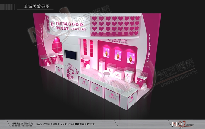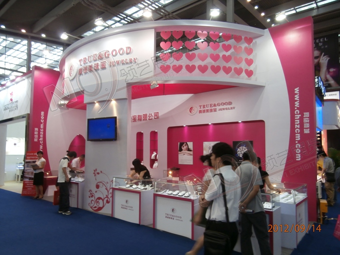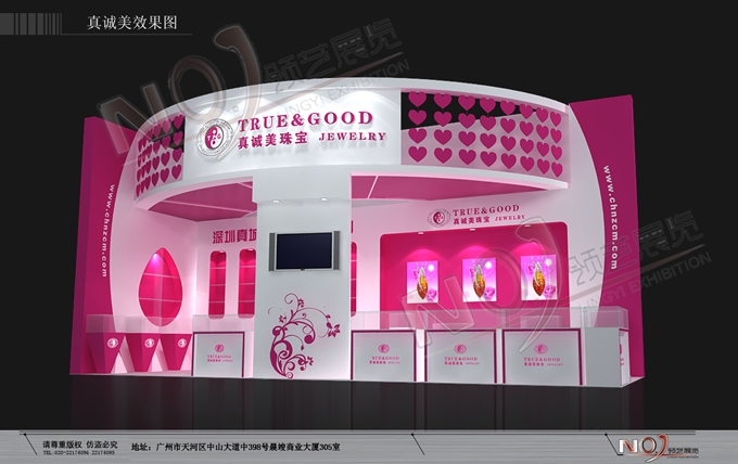 契合真誠美珠寶的品牌形象和產(chǎn)品特性,以弧形結(jié)構(gòu)為主造型,再搭配燈具燈光的效果,襯托出展位絢麗、商務(wù)的氛圍,突出一種典雅、尊貴的時(shí)尚品味。