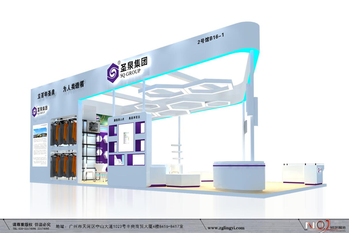 契合山東圣泉品牌形象和產(chǎn)品特性,利用天花造型,再搭配燈具燈光的效果,襯托出展位現(xiàn)代、突出一種現(xiàn)代、高端的時(shí)尚品味。