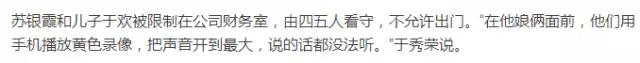 吳學(xué)占讓手下拉屎,并將蘇銀霞按進(jìn)馬桶里,要求還錢。案發(fā)當(dāng)天,蘇銀霞和于歡母子被關(guān)在了一起?!笆裁丛掚y聽他罵什么,沒有錢你去賣,一次一百,我給你八十。學(xué)著喚狗的樣子喊小孩,讓孩子喊他爹。”杜志浩脫下于歡的鞋子,捂在蘇銀霞的嘴上。杜志浩脫下褲子,一只腳踩在沙發(fā)上,用極端手段污辱蘇銀霞。一個(gè)小時(shí)后,失控的于歡,抄起水果刀瘋狂捅向逼債者,結(jié)果四人中刀,其中杜志浩失血過多死亡。