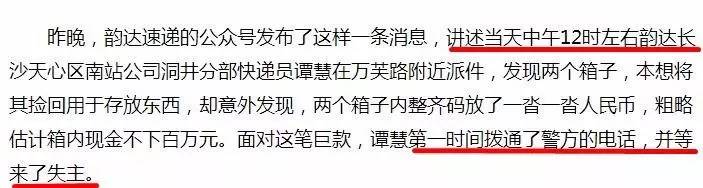 2月18日中午,長沙市洞井安置小區(qū)韻達快遞的員工譚慧在雨花區(qū)萬芙路長安郡小區(qū)二期門前馬路邊撿到一疊現(xiàn)金,給同在一個公司上班的堂哥譚某勝打電話開玩笑說撿到兩箱錢,估計有幾百萬。堂哥讓譚慧報警,但譚慧并沒有報警,也未告知真相,而是原地等待失主十分鐘左右后離開,去往洞井一小區(qū)與譚某勝匯合,并拿出撿到錢說是失主給的感謝費。經(jīng)清點,發(fā)現(xiàn)有1000元錢。當日下午,公司負責(zé)人之一陳某找其核實情況,并要求他問清處警的民警姓名,于是譚慧撥打110,但未說話。后來,因為面子因素和擔(dān)心被責(zé)怪一直沒說出實情,還編造出撿到四、五百萬并報警,有疑似特警人員處警辦理此事,并以此答復(fù)媒體。