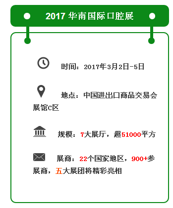 2017年3月2日-2017年3月5日,在中國(guó)進(jìn)出口商品交易會(huì)展館,即將舉辦第二十二屆華南國(guó)際口腔展覽會(huì),屆時(shí)的廣州口腔展展會(huì)設(shè)計(jì)裝修將展現(xiàn)人們對(duì)口腔的重視,為期4天的展會(huì)將迎來(lái)全球100多個(gè)國(guó)家的五萬(wàn)多名口腔醫(yī)療專業(yè)人士,為各位小伙伴們做指導(dǎo)。