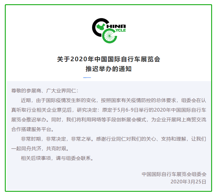 根據(jù)自行車展設計搭建公司領藝展覽了解到,原定于5月6-9日舉行的2020年中國國際自行車展覽會推遲舉辦。同時,主辦方將利用網(wǎng)絡等手段創(chuàng)新展會模式,為企業(yè)開展網(wǎng)上商貿(mào)交流合作搭建服務平臺。如需自行車展設計請聯(lián)系領藝展覽,希望我們能在自行車展搭建上為您添磚加瓦,祝各位朋友收獲多多,滿載而歸!