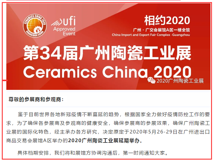 根據(jù)陶瓷展設(shè)計(jì)搭建公司領(lǐng)藝展覽了解到,原定于2020年5月26-29日在廣州進(jìn)出口商品交易會(huì)展館A區(qū)舉辦的2020廣州陶瓷工業(yè)展延期舉辦。如需陶瓷展設(shè)計(jì)請(qǐng)聯(lián)系領(lǐng)藝展覽,希望我們能在陶瓷展搭建上為您添磚加瓦,祝各位朋友收獲多多,滿載而歸!