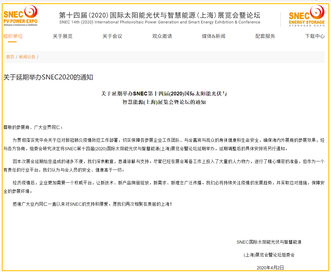 根據(jù)光伏展設(shè)計搭建公司領(lǐng)藝展覽了解到,為貫徹落實黨中央關(guān)于應(yīng)對新冠肺炎疫情防控工作部署,切實保障各參展企業(yè)工作團(tuán)隊、與會嘉賓與觀眾的身體健康和生命安全,確保海內(nèi)外展商的參展效果,經(jīng)與各方協(xié)商,組委會研究決定將SNEC第十四屆(2020)國際太陽能光伏與智慧能源(上海)展覽會暨論壇延期舉辦,延期調(diào)整后的具體安排將另行通知。如需光伏展設(shè)計請聯(lián)系領(lǐng)藝展覽,希望我們能在光伏展搭建上為您添磚加瓦,祝各位朋友收獲多多,滿載而歸!