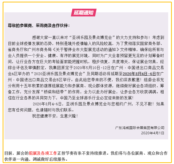 根據(jù)樂(lè)園展設(shè)計(jì)搭建公司領(lǐng)藝展覽了解到,受新冠肺炎疫情影響,原定于2020年5月10日-12日在廣州·中國(guó)進(jìn)出口商品交易會(huì)A區(qū)舉辦的“2020亞洲樂(lè)園及景點(diǎn)博覽會(huì)”及同期活動(dòng)將延期至2020年8月4日-6日在廣州·中國(guó)進(jìn)出口商品交易會(huì)B區(qū)舉行。如需樂(lè)園展設(shè)計(jì)請(qǐng)聯(lián)系領(lǐng)藝展覽,希望我們能在樂(lè)園展搭建上為您添磚加瓦,祝各位朋友收獲多多,滿載而歸!