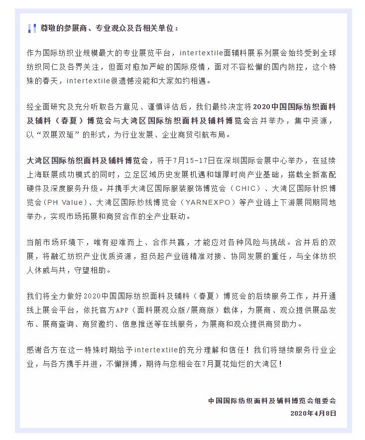 根據(jù)紡織面料展設(shè)計搭建公司領(lǐng)藝展覽了解到,2020中國國際紡織面料及輔料(春夏)博覽會與大灣區(qū)國際紡織面料及輔料博覽會合并舉辦,集中資源,以“雙展雙驅(qū)”的形式,為行業(yè)發(fā)展、企業(yè)商貿(mào)引航布局。