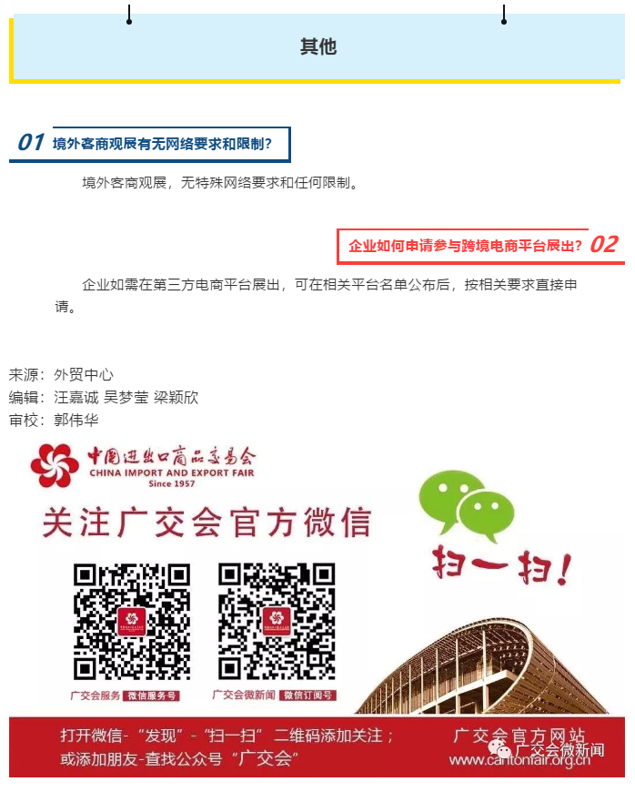 根據(jù)廣交會線上展廳設(shè)計(jì)公司領(lǐng)藝展覽了解到,萬眾矚目的第127屆廣交會,將于6月15-24日在網(wǎng)上舉辦。本屆廣交會如何舉辦,參展企業(yè)如何“云展示”及“云營銷”,都是大家關(guān)心的熱點(diǎn)問題。為做好廣交會在網(wǎng)上舉辦的參展指引工作,及時(shí)讓企業(yè)了解和配合相關(guān)組織工作,大會將視工作進(jìn)展,分多次發(fā)布參展指引。現(xiàn)公布指引之三,敬請關(guān)注!如需廣交會線上展廳設(shè)計(jì)請聯(lián)系領(lǐng)藝展覽,希望我們能在廣交會搭建上為您添磚加瓦,祝各位朋友收獲多多,滿載而歸!