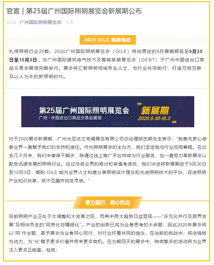 廣州照明展設(shè)計(jì)搭建公司領(lǐng)藝展覽了解到,扎根照明行業(yè)25載,2020廣州國(guó)際照明展覽會(huì)(GILE)將由原定的6月展期順延至9月30日至10月3日,與廣州國(guó)際建筑電氣技術(shù)及智能家居展覽會(huì)(GEBT)于廣州中國(guó)進(jìn)出口商品交易會(huì)展館同期舉行。展會(huì)將匯聚照明領(lǐng)域?qū)I(yè)人士,與行業(yè)共同前行,打造萬(wàn)物互聯(lián)及以人為本的新照明時(shí)代。如需照明展設(shè)計(jì)請(qǐng)聯(lián)系領(lǐng)藝展覽,希望我們能在照明展搭建上為您添磚加瓦,祝各位朋友收獲多多,滿載而歸!