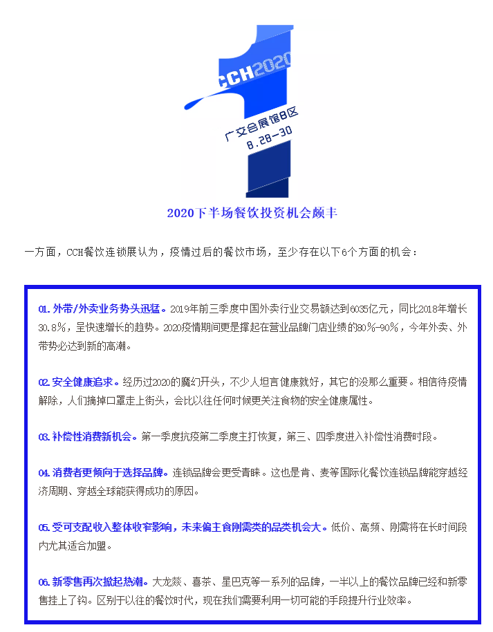 從6月底開始,上海、北京等地的各類展會,將陸續(xù)分期召開。而定檔于8月28-30日的CCH國際餐飲連鎖加盟展覽會(以下簡稱:CCH餐飲連鎖展),也將在廣交會展館B區(qū)隆重揭幕。