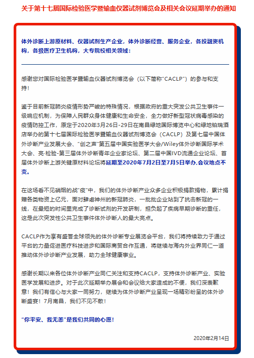 鑒于目前新冠肺炎疫情形勢(shì)嚴(yán)峻的特殊情況,根據(jù)政府的重大突發(fā)公共衛(wèi)生事件一級(jí)響應(yīng)機(jī)制,為保障人民群眾身體健康和生命安全,全力做好新型冠狀病毒感染的疫情防控工作,據(jù)上海檢驗(yàn)醫(yī)學(xué)展搭建商領(lǐng)藝展覽了解到原定于2020年3月26日-29日在南昌綠地國際博覽中心和綠地鉑瑞酒店舉辦的第十七屆國際檢驗(yàn)醫(yī)學(xué)暨輸血儀器試劑博覽會(huì)(CACLP)及第七屆中國體外診斷產(chǎn)業(yè)發(fā)展大會(huì)、“創(chuàng)之聲”第五屆中國實(shí)驗(yàn)醫(yī)學(xué)大會(huì)/Wiley體外診斷國際學(xué)術(shù)大會(huì)、亮·檢驗(yàn)-第三屆體外診斷青年企業(yè)家論壇、第二屆中國IVD流通企業(yè)論壇、首屆體外診斷上游關(guān)鍵原材料論壇將延期至2020年7月2日至7月5日舉辦,會(huì)議地點(diǎn)不變。領(lǐng)藝展覽為您上海檢驗(yàn)醫(yī)學(xué)展設(shè)計(jì)搭建保駕護(hù)航。