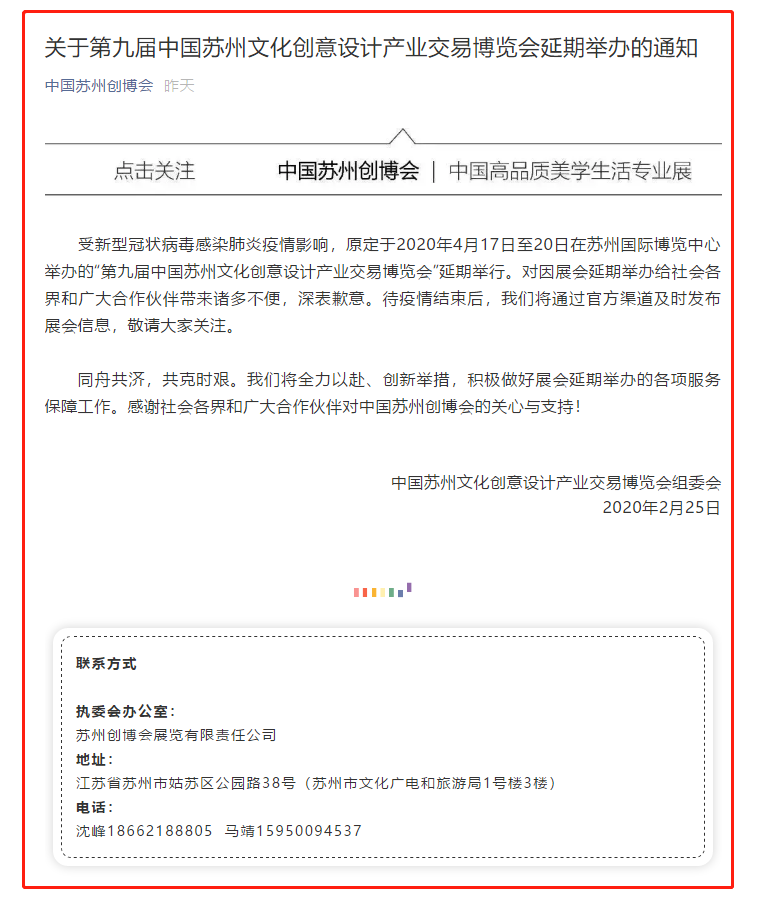 根據(jù)蘇州創(chuàng)博會設(shè)計搭建公司領(lǐng)藝展覽了解到,受新型冠狀病毒感染肺炎疫情影響,原定于2020年4月17日至20日在蘇州國際博覽中心舉辦的“第九屆中國蘇州文化創(chuàng)意設(shè)計產(chǎn)業(yè)交易博覽會”延期舉行。如需創(chuàng)博會設(shè)計請聯(lián)系領(lǐng)藝展覽,希望我們能在蘇州創(chuàng)博會搭建上為您添磚加瓦,祝各位朋友收獲多多,滿載而歸!