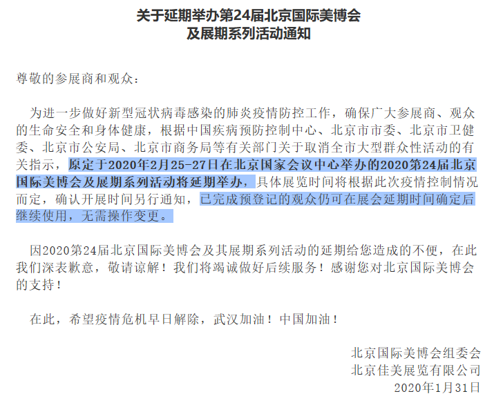 為進(jìn)一步做好新型冠狀病毒感染的肺炎疫情防控工作,確保廣大參展商、觀眾的生命安全和身體健康,根據(jù)中國疾病預(yù)防控制中心、北京市市委、北京市衛(wèi)健委、北京市公安局、北京市商務(wù)局等有關(guān)部門關(guān)于取消全市大型群眾性活動的有關(guān)指示,原定于2020年2月25-27日在北京國家會議中心舉辦的2020第24屆北京國際美博會及展期系列活動將延期舉辦,具體展覽時間將根據(jù)此次疫情控制情況而定,確認(rèn)開展時間另行通知,已完成預(yù)登記的觀眾仍可在展會延期時間確定后繼續(xù)使用,無需操作變更。如需北京美博會設(shè)計請聯(lián)系領(lǐng)藝展覽,希望我們能在北京美博會搭建上為您添磚加瓦,祝各位朋友收獲多多,滿載而歸!
