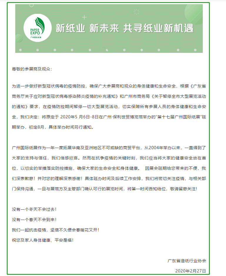 根據(jù)紙展設(shè)計(jì)搭建公司領(lǐng)藝展覽了解到,為進(jìn)一步做好新型冠狀病毒的疫情防控,確保廣大參展商和觀眾的身體健康和生命安全,根據(jù)《廣東省商務(wù)廳關(guān)于應(yīng)對(duì)新型冠狀病毒感染肺炎疫情的補(bǔ)充通知》和廣州市商務(wù)局《關(guān)于暫停全市大型展覽活動(dòng)的通知》要求,在疫情防控期間暫停一切大型展覽活動(dòng),切實(shí)保障所有參展人員的身體健康和生命安全,主辦決定:將原定于2020年5月6日-8日在廣州·保利世貿(mào)博覽館舉辦的“第十七屆廣州國(guó)際紙展”延期舉辦,初定8月,具體舉辦時(shí)間另行通知。如需紙展設(shè)計(jì)請(qǐng)聯(lián)系領(lǐng)藝展覽,希望我們能在紙展搭建上為您添磚加瓦,祝各位朋友收獲多多,滿(mǎn)載而歸!