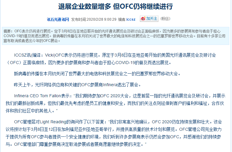 根據(jù)光纖通訊展設(shè)計(jì)搭建公司領(lǐng)藝展覽了解到,Infinera CEO Tom Fallon表示:“我們期待參加OFC 2020大會,這是首屈一指的光網(wǎng)絡(luò)會議,并展示我們的最新創(chuàng)新成果,但我們最優(yōu)先考慮的是員工的健康和安全,而我們的關(guān)注點(diǎn)則延伸到客戶的福利和福祉,合作伙伴和我們社區(qū)中的其他人。”O(jiān)FC管理層對Light Reading的詢問作了以下答復(fù):“我們非常高興地確認(rèn),OFC 2020仍在持續(xù)發(fā)展和壯大。該會議將按計(jì)劃于3月8日至12日在加利福尼亞州圣地亞哥舉行,并提供高質(zhì)量的技術(shù)計(jì)劃和展覽。OFC管理公司完全致力于提供為所有OFC參與者提供一個(gè)安全健康的環(huán)境,我們聽到許多參展商表示仍然會參加OFC,并感謝他們的持續(xù)參與。OFC管理部門尊重參展商決定取消參展并愿意合作的決定。”如需光纖通訊展設(shè)計(jì)請聯(lián)系領(lǐng)藝展覽,希望我們能在光纖通訊展搭建上為您添磚加瓦,祝各位朋友收獲多多,滿載而歸!