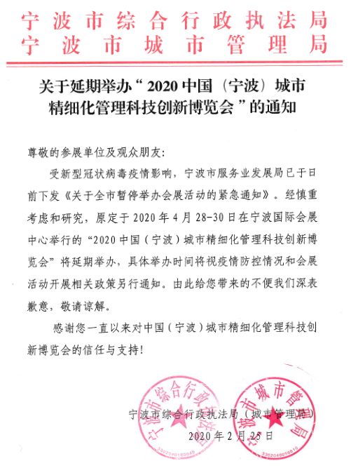 根據(jù)展臺(tái)設(shè)計(jì)搭建公司領(lǐng)藝展覽了解到,2020中國(guó)(寧波)城市精細(xì)化管理科技創(chuàng)新博覽會(huì)將延期舉辦。如需展臺(tái)設(shè)計(jì)請(qǐng)聯(lián)系領(lǐng)藝展覽,希望我們能在展位搭建上為您添磚加瓦,祝各位朋友收獲多多,滿載而歸!