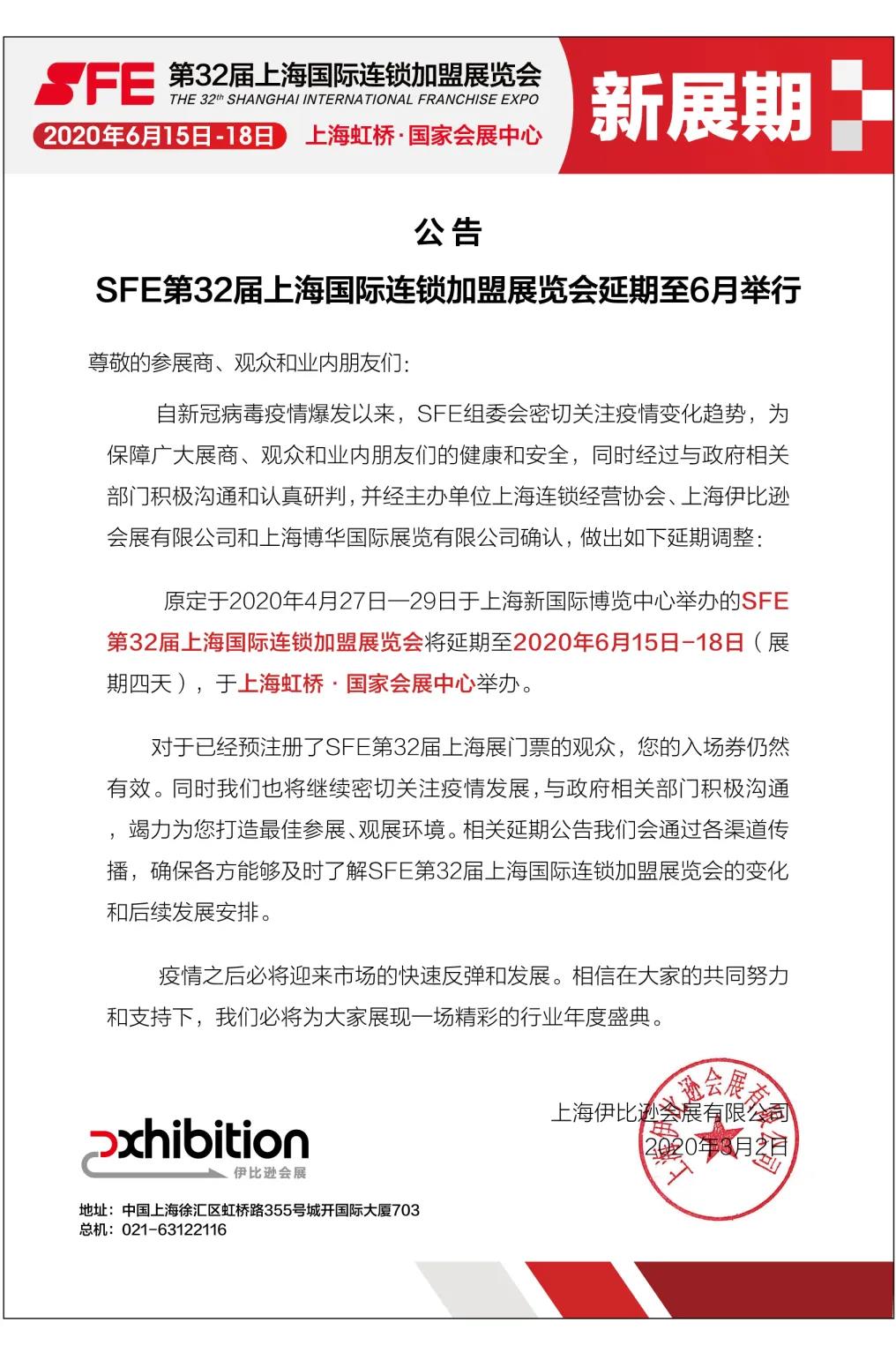 根據(jù)上海連鎖加盟展設計搭建公司領藝展覽了解到,6月15日-18日,連鎖加盟行業(yè)巔峰盛會——SFE第32屆上海國際連鎖加盟展覽會,將會在上海虹橋·國家會展中心盛裝亮相! 如需上海連鎖加盟展設計請聯(lián)系領藝展覽,希望我們能在上海連鎖加盟展搭建上為您添磚加瓦,祝各位朋友收獲多多,滿載而歸!