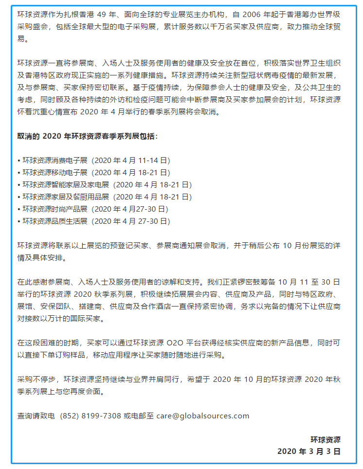 根據(jù)品質(zhì)生活展設(shè)計搭建公司領(lǐng)藝展覽了解到,環(huán)球資源作為扎根香港 49 年、面向全球的專業(yè)展覽主辦機構(gòu),自 2006 年起于香港籌辦世界級采購盛會,包括全球最大型的電子采購展,累計服務(wù)數(shù)以千萬名買家及供應(yīng)商,致力推動全球貿(mào)易?;谝咔槌掷m(xù),為保障參會人士的健康及安全,及公共衛(wèi)生的考慮,同時顧及各種持續(xù)的外訪和檢疫問題可能會中斷參展商及買家參加展會的計劃,環(huán)球資源懷著沉重心情宣布 2020 年 4 月舉行的春季系列展將會取消。原計劃環(huán)球資源品質(zhì)生活展展會時間是2020 年 4 月 27-30 日。環(huán)球資源將聯(lián)系展覽的預(yù)登記買家、參展商通知展會取消,并于稍后公布 10 月份展覽的詳情及具體安排。如需品質(zhì)生活展展臺設(shè)計請聯(lián)系領(lǐng)藝展覽,希望我們能在品質(zhì)生活展展臺搭建上為您添磚加瓦,祝各位朋友收獲多多,滿載而歸!