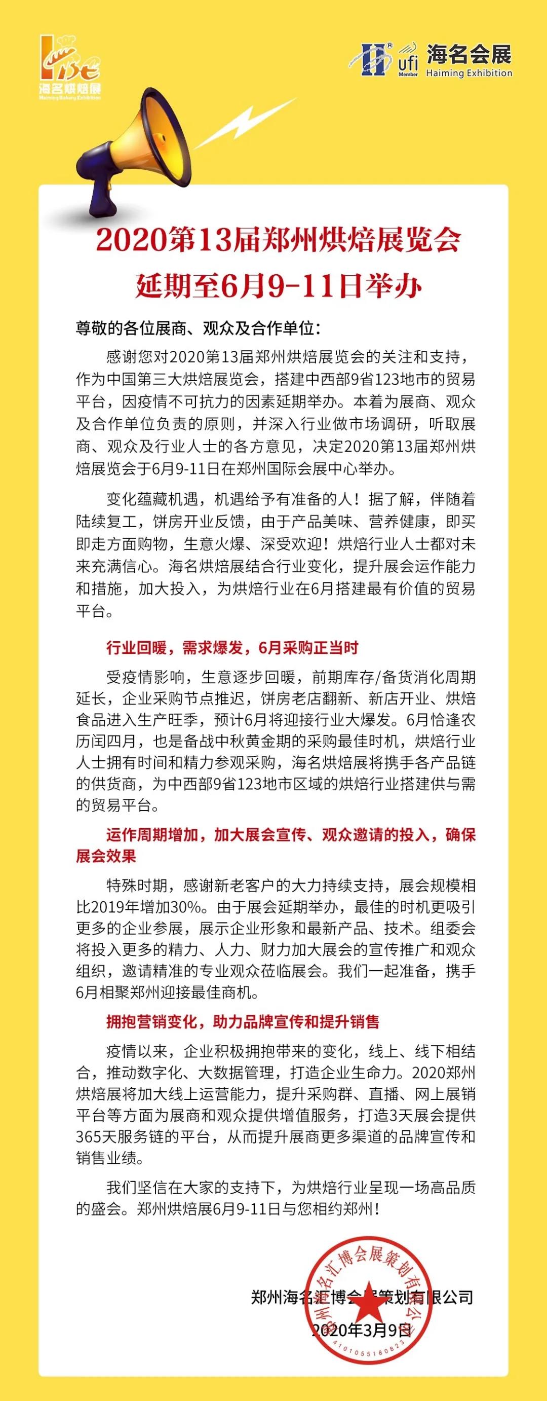 根據(jù)烘培展展臺(tái)設(shè)計(jì)搭建公司領(lǐng)藝展覽了解到,2020第13屆鄭州烘焙展覽會(huì)延期至6月9-11日舉辦。如需烘焙展展臺(tái)設(shè)計(jì)請(qǐng)聯(lián)系領(lǐng)藝展覽,希望我們能在烘焙展展臺(tái)搭建上為您添磚加瓦,祝各位朋友收獲多多,滿(mǎn)載而歸!