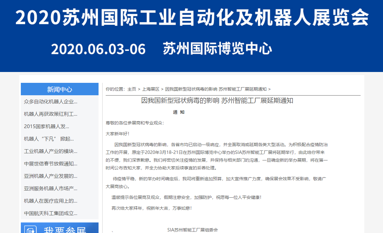 根據(jù)蘇州展臺設(shè)計搭建公司領(lǐng)藝展覽了解到,因我國新型冠狀病毒的影響,各省市均已啟動一級響應(yīng),并全面取消或延期各類大型活動。為積極配合疫情防治工作的開展,原定于2020年3月18-21日在蘇州國際博覽中心舉辦的SIA蘇州智能工廠展將延期舉行,如需蘇州展臺設(shè)計請聯(lián)系領(lǐng)藝展覽,希望我們能在蘇州展臺搭建上為您添磚加瓦,祝各位朋友收獲多多,滿載而歸!