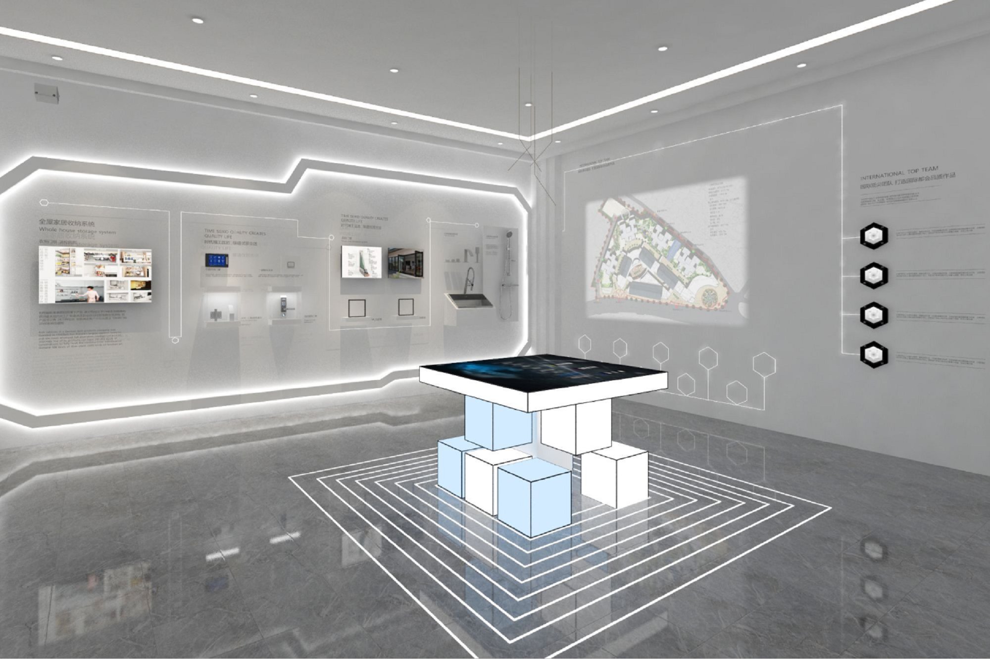 契合萬科的品牌形象和產(chǎn)品特性,采用開放式結(jié)構(gòu)進行合理的分區(qū),再搭配燈具燈光的效果,襯托出展廳大氣、豪華的氛圍,突出一種簡約、時尚的品味。