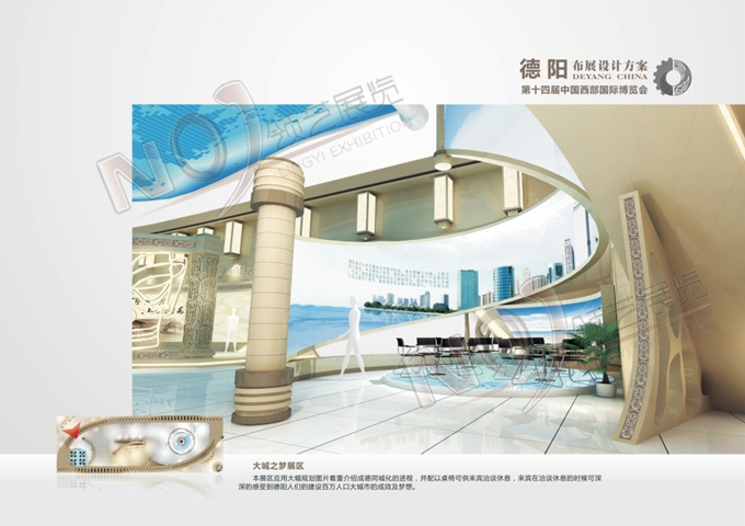 契合德陽(yáng)地區(qū)的品牌形象和產(chǎn)品特性,以齒輪元素為主造型,中部展區(qū)采用雙通道多媒體視頻循環(huán)播放展示德陽(yáng)發(fā)展路程的視頻,并配以桌椅可供來(lái)賓洽談休息,從中體現(xiàn)德陽(yáng)人們的建設(shè)百萬(wàn)人口大城市的成效及夢(mèng)想。