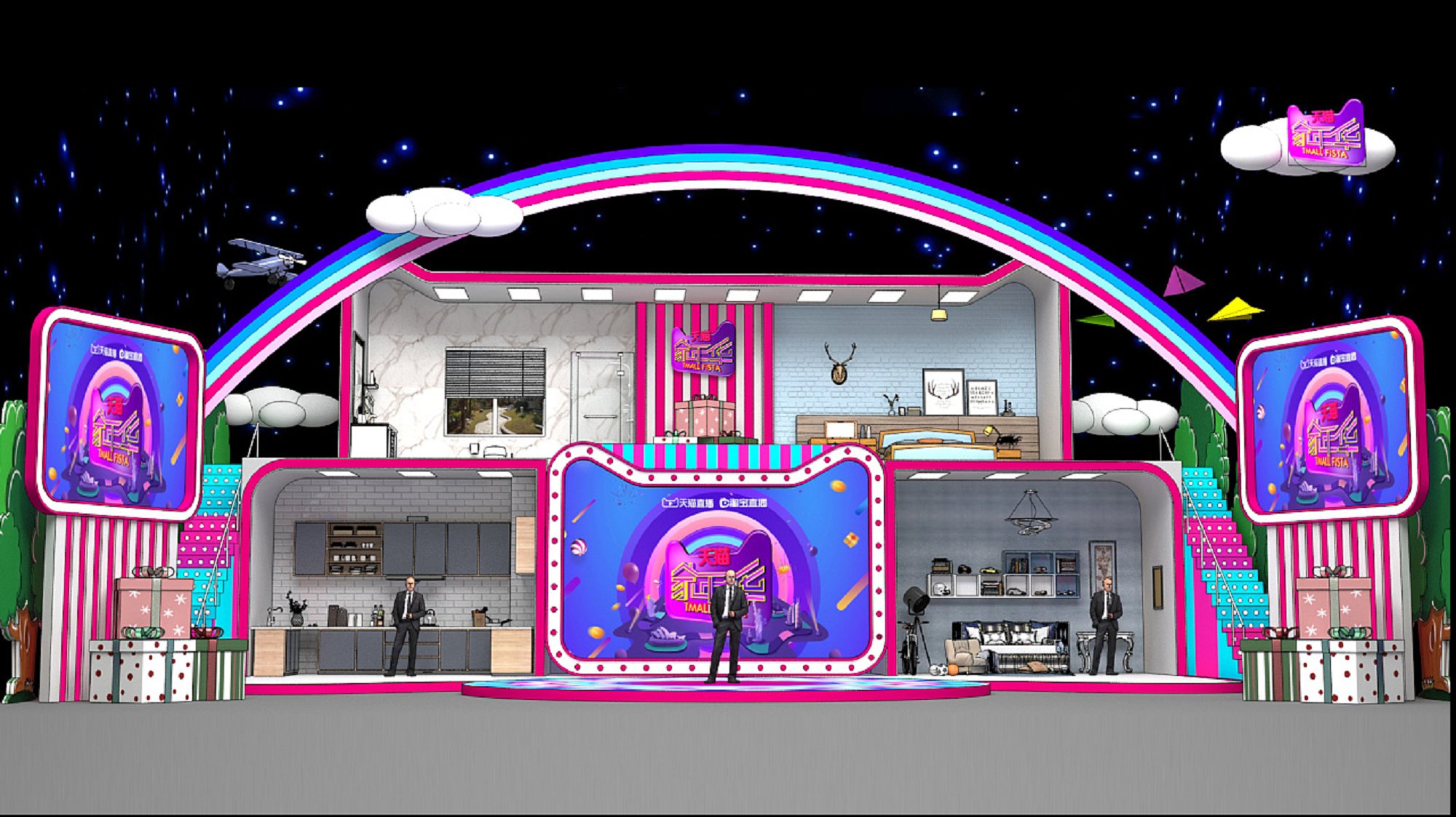 契合天貓的品牌形象和產(chǎn)品特性,采用開放式結構,再搭配燈具燈光的效果,襯托出直播間大氣、豪華的氛圍,突出一種簡約、時尚的品味。